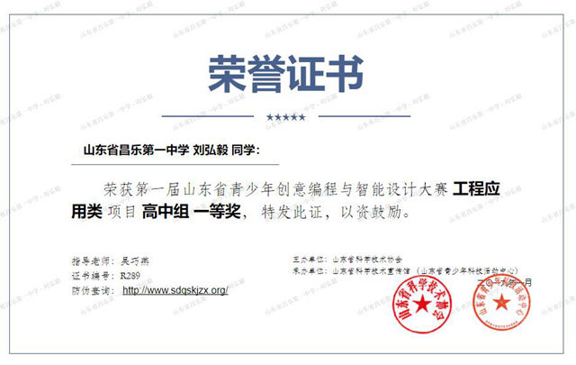 近日,第一届山东省青少年创意编程与智能设计大赛获奖名单揭晓,我校高二五班刘弘毅同学的作品《心脏病人紧急呼叫设备设计》在智能设计大赛中经过层层角逐,以创意突出、设计新颖,实用性强,表述清晰等特点获得在场评委的一致好评,荣获大赛一等奖。