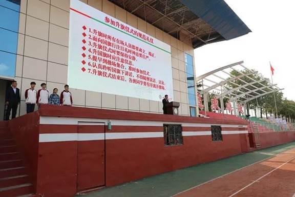 王吉东主任在讲话中说,国旗是国家的标志性旗帜,是国家的象征;国歌,代表一个国家的歌声,是国家尊严的标志,代表着人民的心声,也是一个国家和民族的历史缩影。通过升旗仪式,我们要向为中华民族崛起而牺牲的先烈们致敬,向祖国敬礼,这应该是全体师生发自心灵、源自精神的崇高礼仪。