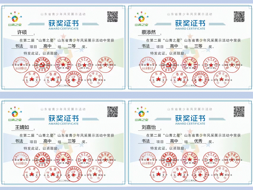 语文教研室和美术教研室积极发挥带头作用,分别开设了学生硬笔、软笔书法课程。美术教研室培养组织有书法特长的学生参加上级部门组织的各类书法赛事,近几年来,先后有郭立增、赵令臻、赵文博、徐丽红、王晓娟、郭菁等老师在市县“庆祝中国共产党成立100周年”书画比赛等活动中取得优异成绩,张晨红老师的《书法结字原理之匀称、协稳原理》被评为潍坊市 “一师一优课,一课一名师”活动市级优课。