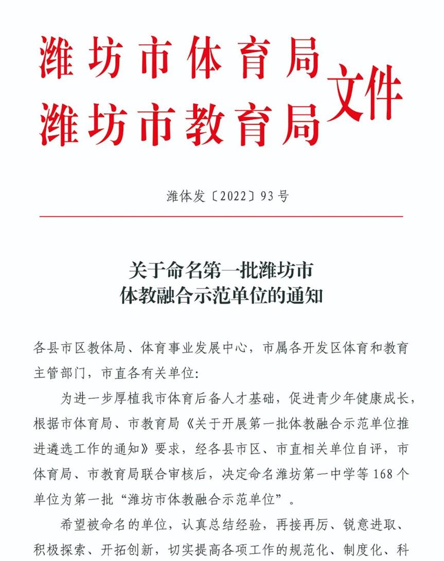 近日,潍坊市教体局公布了评选结果,我校被评选为潍坊市第一批“体教融合示范单位”。