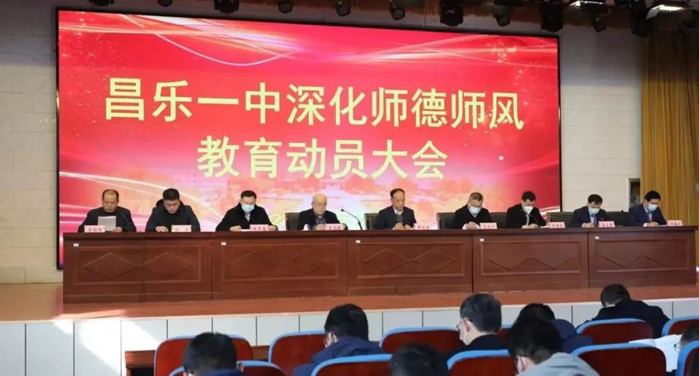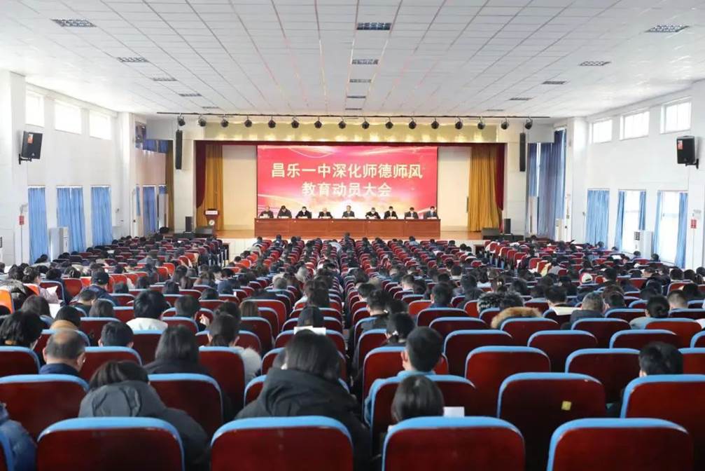 为落实好《关于印发<昌乐县教育系统师德师风建设“十个一”专项活动实施方案>的通知》(乐教体字[2023]2号)文件精神,深刻领会和落实昌乐县教育系统深化师德师风教育大会精神,进一步加强教师队伍建设,提高教师队伍思想政治素质和职业道德水平,2月11日上午,昌乐一中深化师德师风教育动员大会在智慧楼报告厅隆重举行,学校党委书记、总校长黄发国作动员讲话,副校长吴文福主持大会,全体教职工参加。