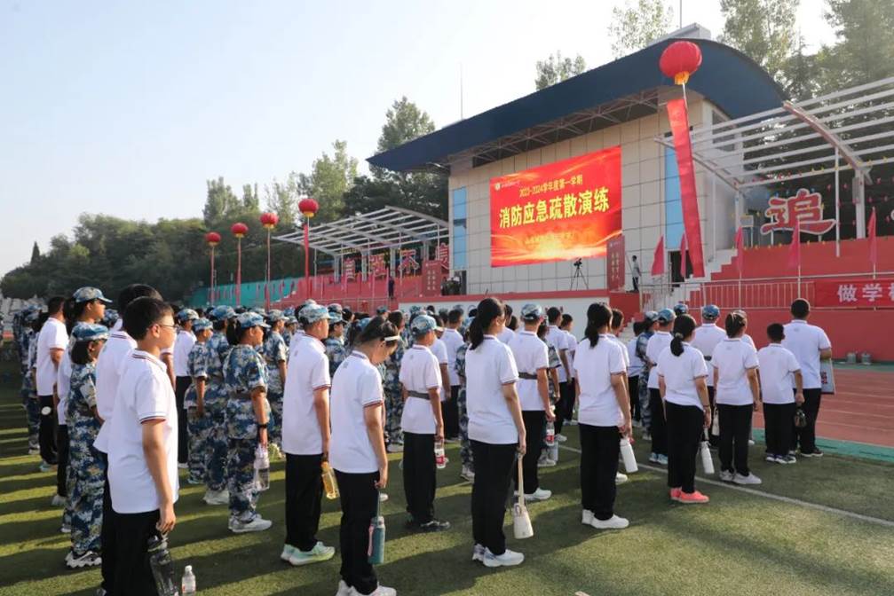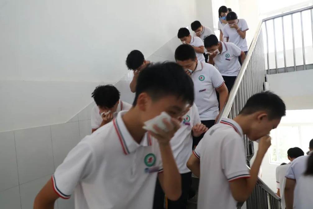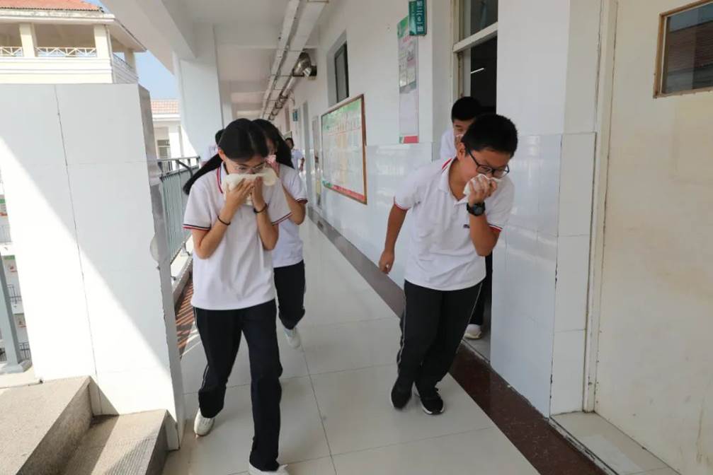 演练活动在一阵阵哨声中正式开始。全体学生在级部领导、体育教师、班主任、医护人员、安保人员的组织下,按疏散路线紧张而有序地撤出教学楼和教室,按照既定的逃生路线到达指定安全地点。