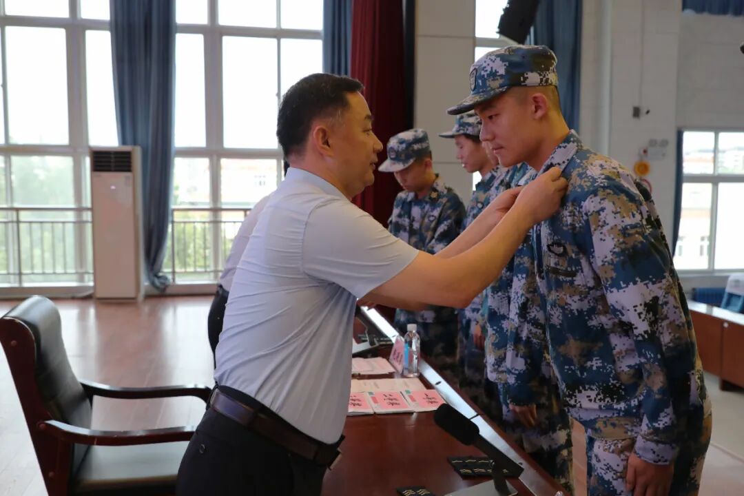 仪式开始,全体起立,高唱国歌。随后,海航办主任徐新伟通报了海航实验班2025年度考核鉴定情况及2025级新生录取情况。在庄严的《人民海军向前进》中,学校党委书记、校长陈子友为2025级海航实验班授班旗。随后,2023级、2024级、2025级海航学生代表依次上台,学校领导为海航学生佩戴象征使命和荣誉的领章。