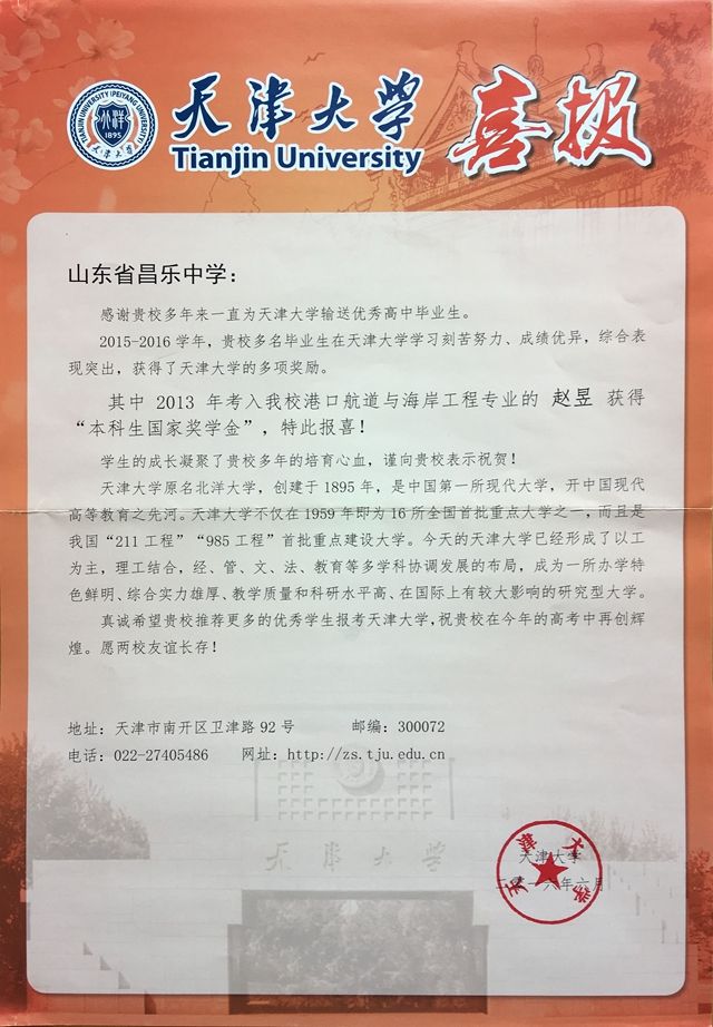 热烈祝贺我校毕业生赵昱同学在天津大学荣获2016年“本科生国家奖学金”。
