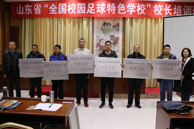 2017年12月,由山东省教育厅体卫艺处和山东省校园足球发展研究中心共同举办的2017年山东省“全国青少年校园足球特色学校”校长培训班在山东省济南市燕子山庄举行。我校代表王本营老师参加了本期培训班。培训班上,山东省教育厅体卫艺处副处长赵复兴就我省青少年校园足球工作发表了重要意见,山东省校园足球发展研究中心主任马玉华对参会人员进行了培训。赵复兴副处长和马玉华主任共同为我省获得“全国青少年校园足球特色学校”的单位授牌。
