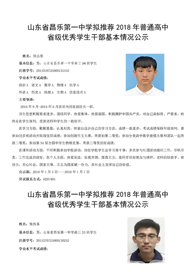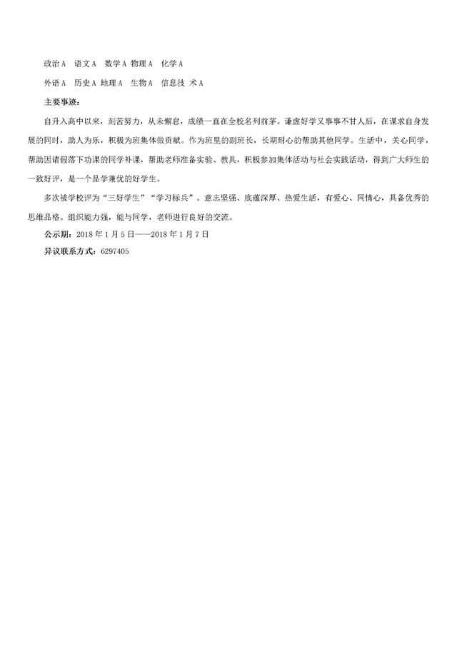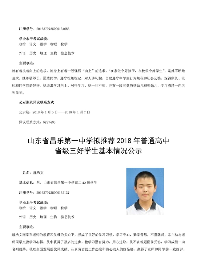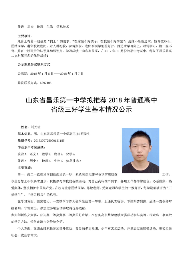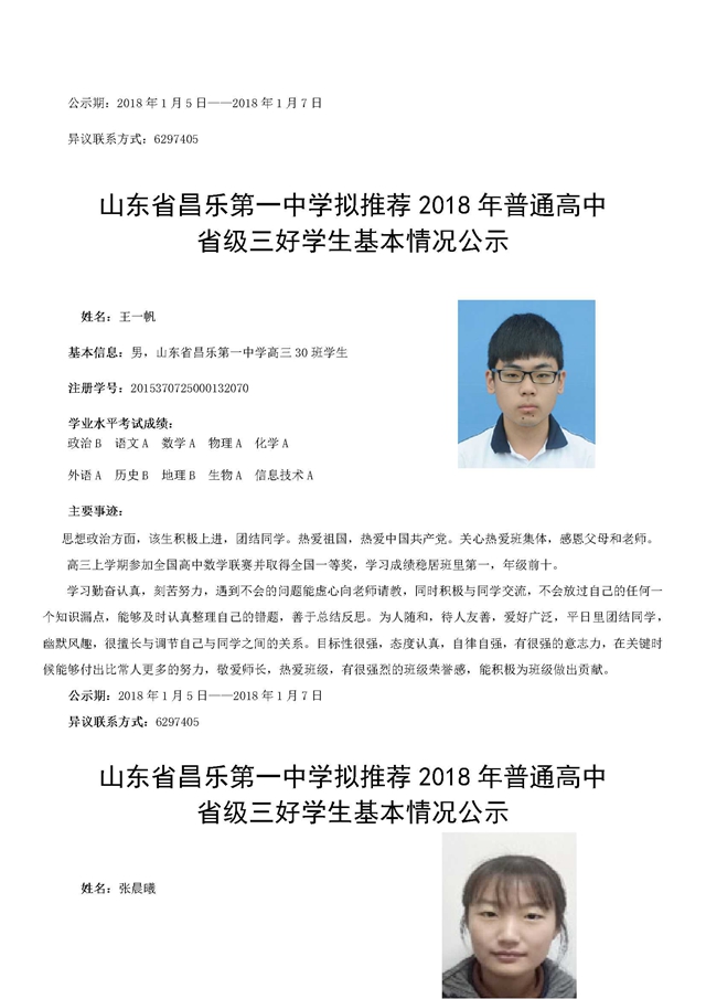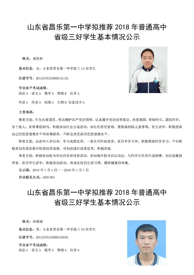 拟推荐2018年普通高中省级三好/优秀干部学生第二次公示