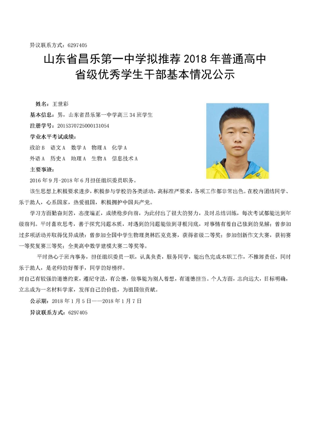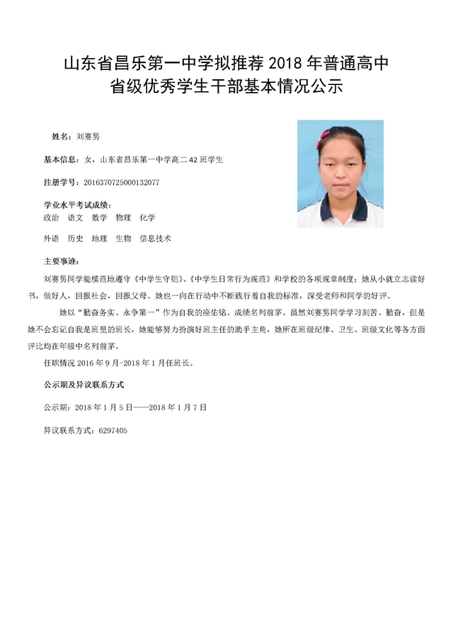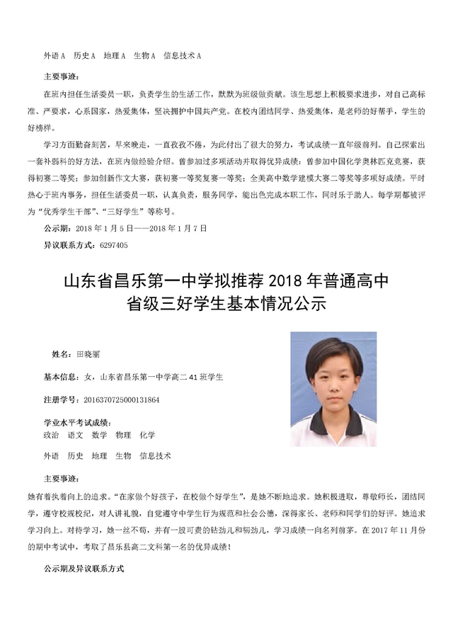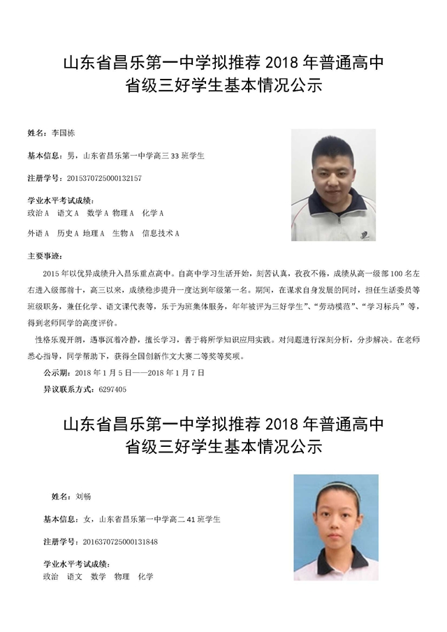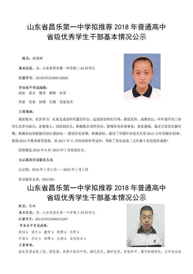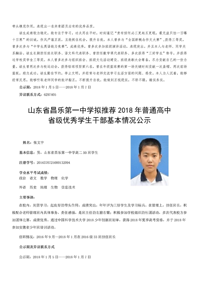 拟推荐2018年普通高中省级三好/优秀干部学生第二次公示