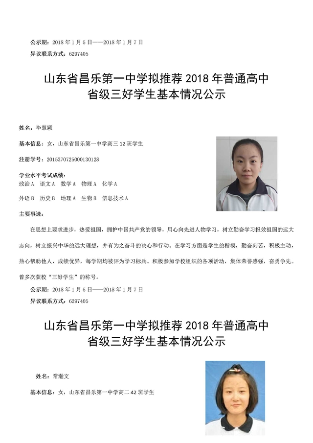 拟推荐2018年普通高中市级三好/优秀干部学生第二次公示
