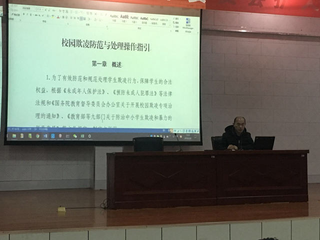 在会上,刘校长就学生假期安全和校园安全作了详细的部署。他要求全体班主任要提高安全认识,明确责任,要通过和家长签订安全责任书、编制安全提示短信等方式,利用班级微信群、电话等告知学生和家长相关的安全知识,确保学生过一个安全、健康、有意义的寒假。针对校园安全,刘校长强调:各班班主任要对本班教室、宿舍内的用水、用电等进行彻底排查,填写安全台账,做到有问题要立即整改,确保不出问题。最后,刘校长就校园欺凌问题做了专题报告。