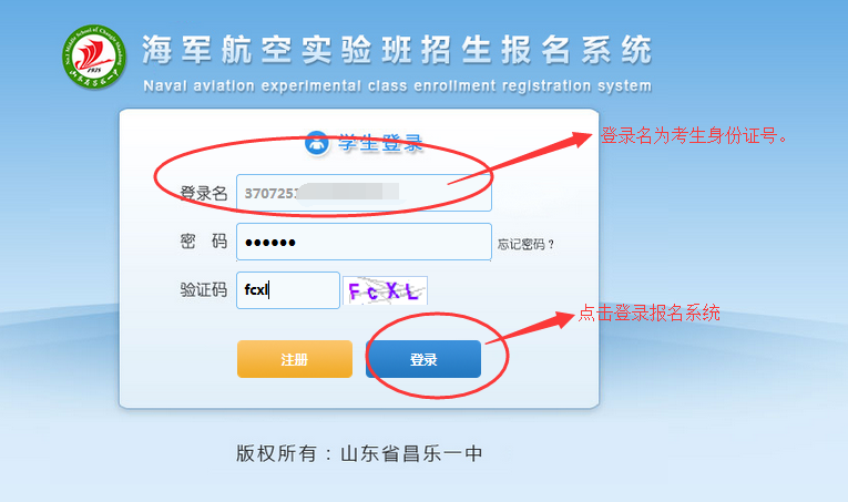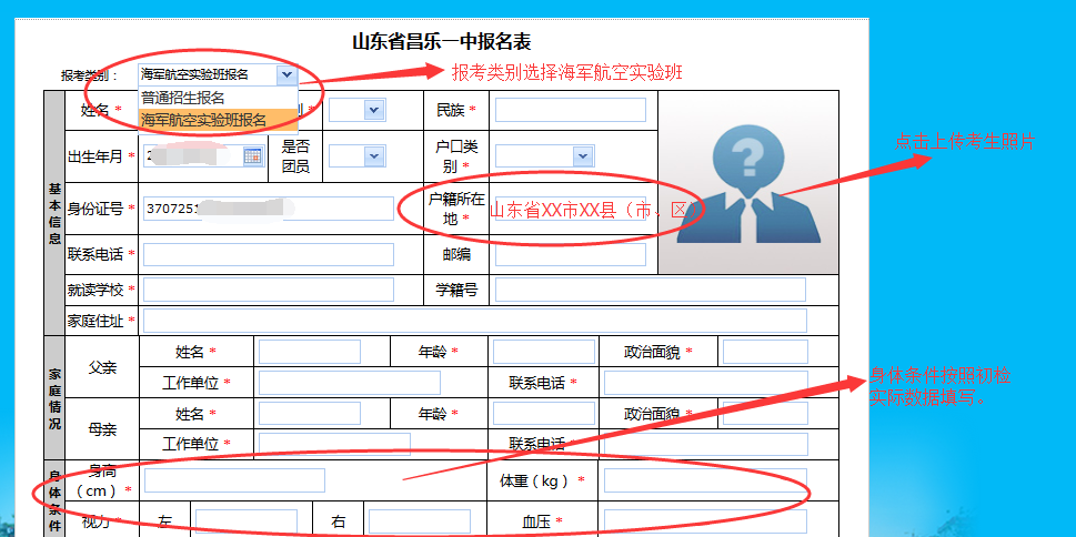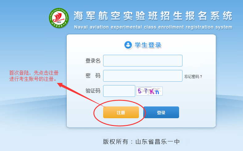 考生自检合格后,点击网站右侧“山东省海军航空实验班报名”进入报名系统,进行注册报名,报名时请注意: