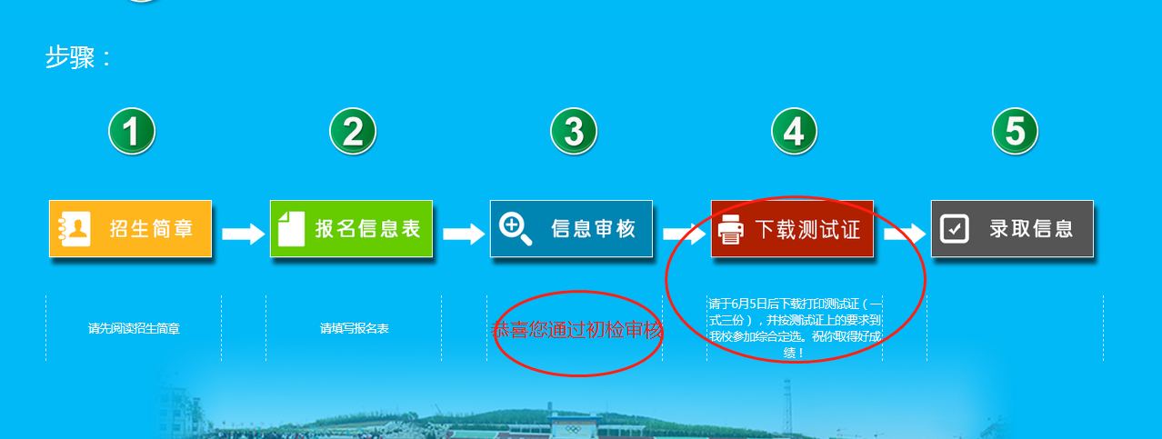 考生于6月5日后登录报名系统查看初选审查结果,初审通过后请自行下载打印《定选测试证》(一式三份)。考生按测试证要求携带身份证(户口本)、《报名初检表》原件、《定选测试证》来我校参加文化测试和定选考核。