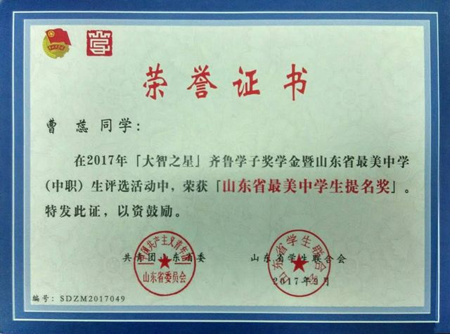 在共青团山东省委、山东省学生联合会组织的2017年“大智之星”山东省最美中学(中职)生评选活动中,我校2015级曹蕊同学荣获“山东省最美中学生提名奖”。
