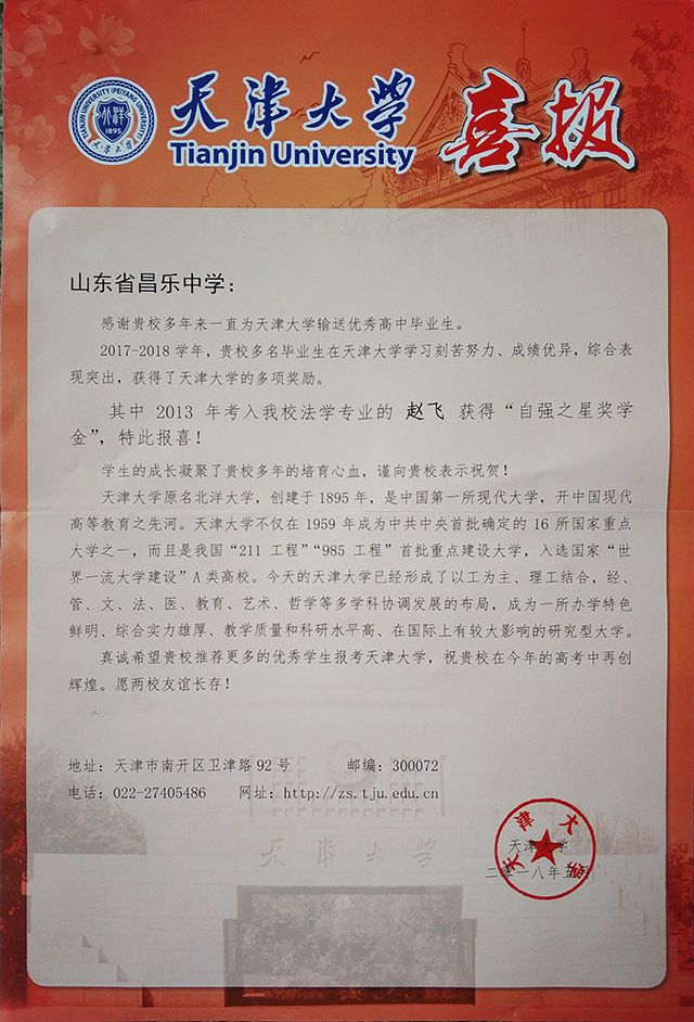 近日,天津大学为昌乐一中送来感谢信,感谢昌乐一中为其输送的大批品学兼优的毕业生。来信中提到:我校2013届毕业生、天津大学法学院2017级法学硕士、天津大学学生校长助理赵飞同学获得“自强之星奖学金”,在大学期间学习刻苦努力,成绩优异,综合表现突出,在校期间获得了多项奖励,受到了全校师生的广泛认可和好评。来信中还表示,对全体教师的辛勤工作和精心培育表示感谢,并祝愿昌乐一中在2018年高考中再创辉煌。