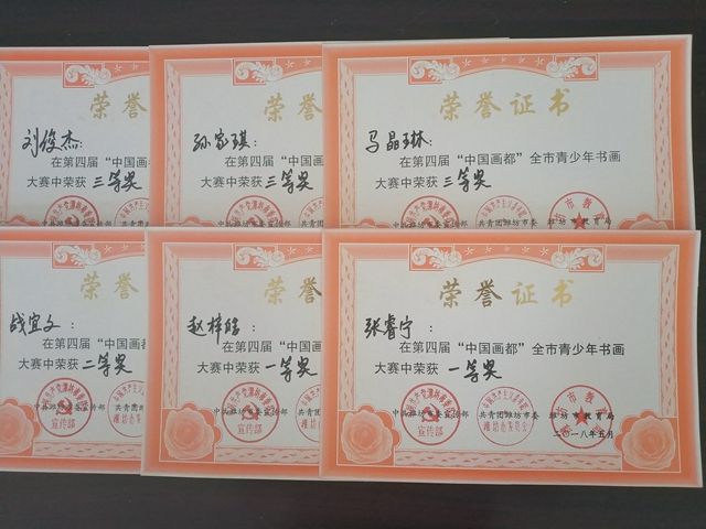 为参加这次大赛,我校团委和美术组积极组织,认真准备,推选优秀作品参加了此次大赛。赵梓皓、张睿宁同学双双荣获高中组一等奖,战宜文同学荣获高中组二等奖,马晶琳、张家琪同学荣获高中组三等奖,刘俊杰老师荣获青年组三等奖。