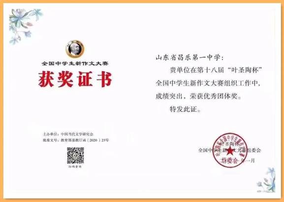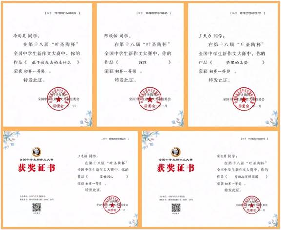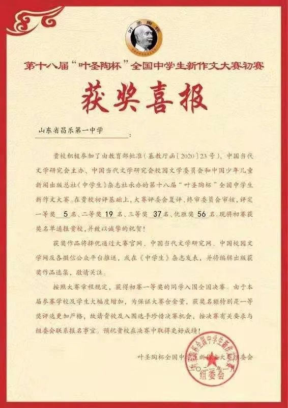近日,在第十八届“叶圣陶杯”全国中学生新作文大赛初赛中,昌乐一中学子喜获佳绩,共获得一等奖5名、二等奖19名、三等奖37名、优胜奖56名,获奖人数再创新高,我校荣获优秀团体奖。按照大赛章程规定,我校获得初赛一等奖的冷昀昊、陈欣怡、王天力、王逸诺、宋佳茵五名同学将入围全国决赛。