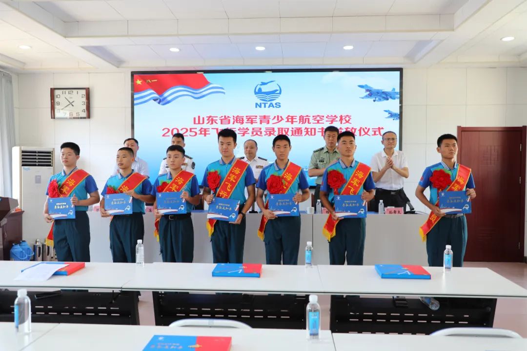 随后举行了隆重的录取通知书颁发仪式,在雄壮的《人民海军向前进》音乐中,飞行学员身披绶带、胸戴光荣花依次上台从主席台领导手中接过飞行学员录取通知书并合影留念。飞行学员代表段春鑫在发言中感谢人民海军、学校和老师的培养,表示升入海军航空大学后将苦练精飞,早日成为一名优秀的海军飞行员。